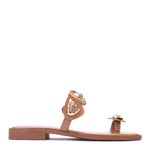 Cheia de estilo e versatilidade, esta flat da Off Calçados é perfeita para quem busca um visual moderno sem abrir mão do conforto. Confeccionada em tom marrom neutro, o modelo conta com tiras delicadas e aplicações douradas que trazem sofisticação e um toque fashion ao look. O design flat proporciona praticidade para o dia a dia, enquanto o acabamento elegante permite composições tanto casuais quanto mais arrumadas.