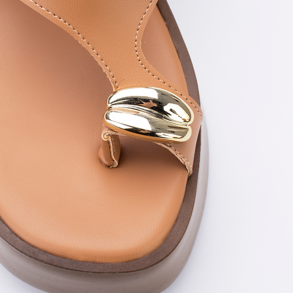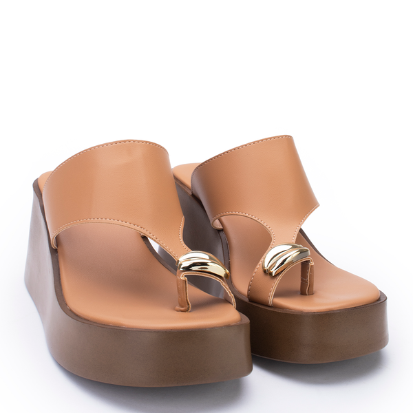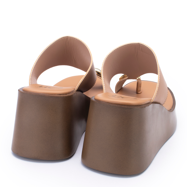 Uma sandália de salto plataforma com design minimalista, elegante e detalhe no cabedal.