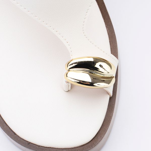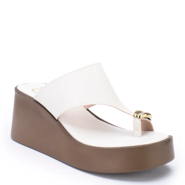 Uma sandália de salto plataforma com design minimalista, elegante e detalhe no cabedal.