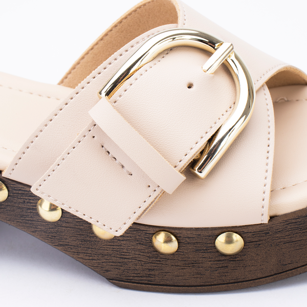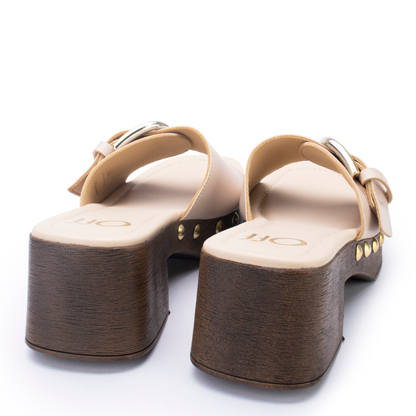 Com tiras cruzadas em tom neutro, valoriza os pés e garante firmeza ao caminhar. O destaque fica por conta das pedrarias turquesa e aplicações douradas, que adicionam um ar artesanal moderno ao modelo. O salto bloco amadeirado oferece estabilidade e conforto, ideal para usar do dia à noite com produções mais elaboradas ou casuais.